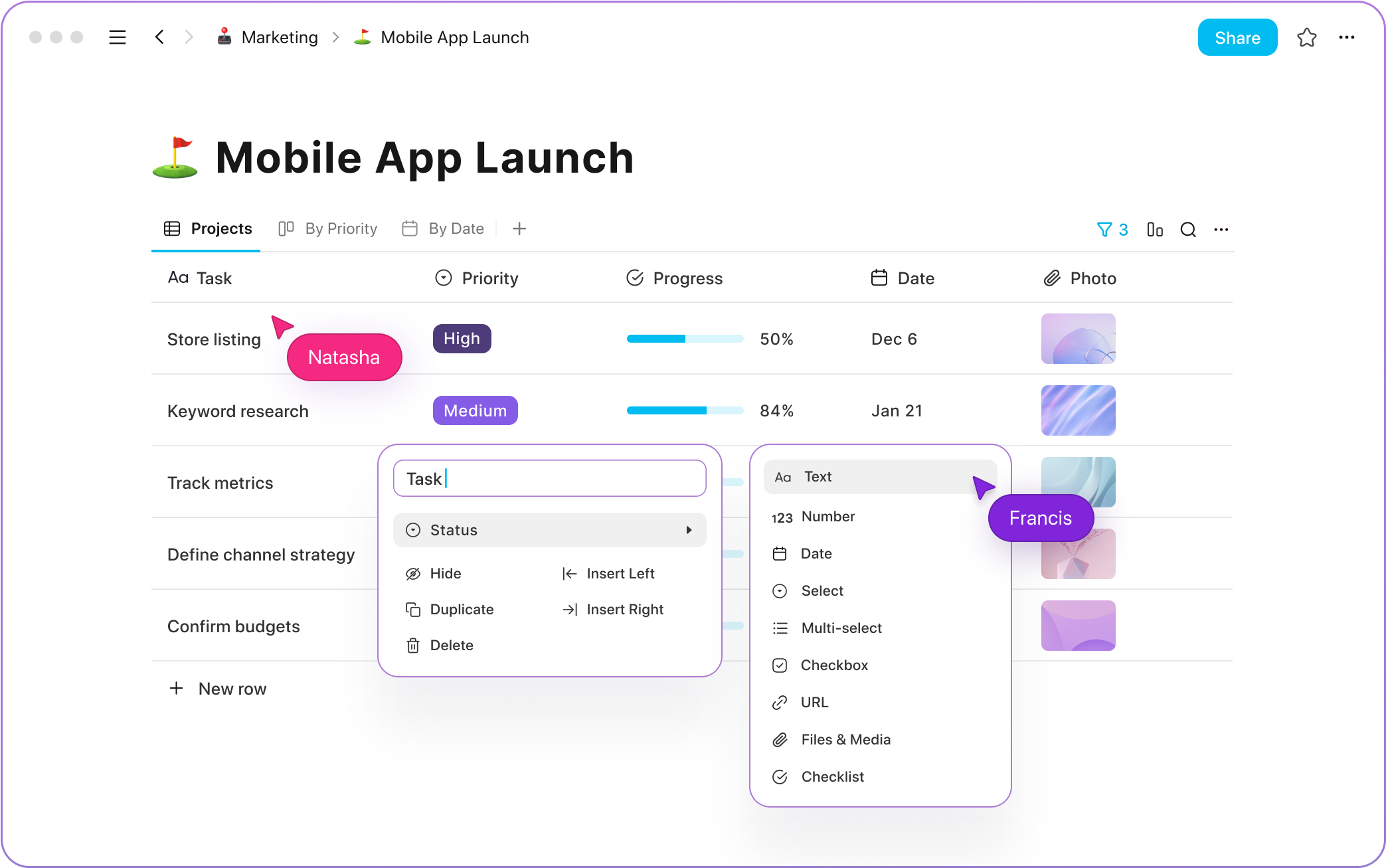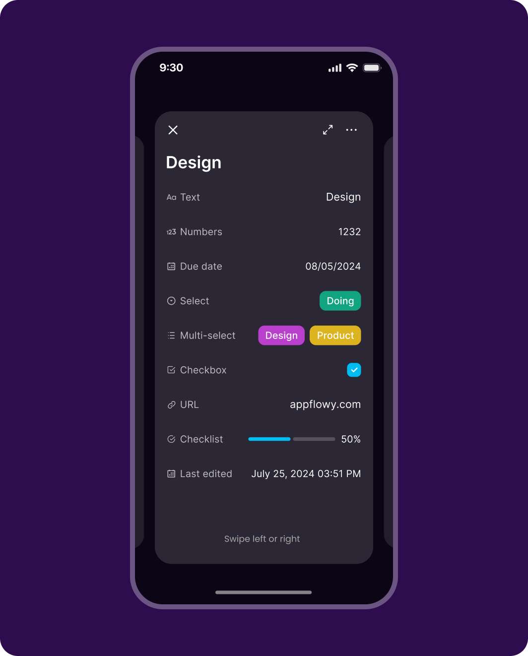 Deep dive into task details with card views. Easily manage database records on the go.